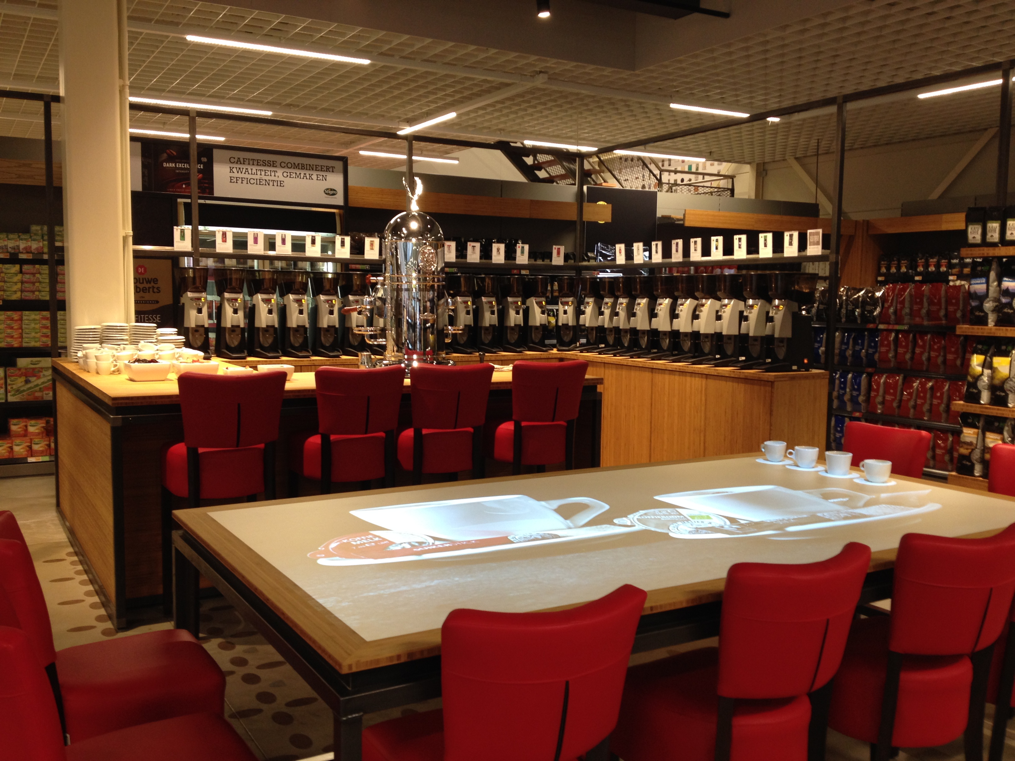 De koffiehoek is ook voor mensen die geen koffie drinken om van te watertanden. Kijk die tafel nou!