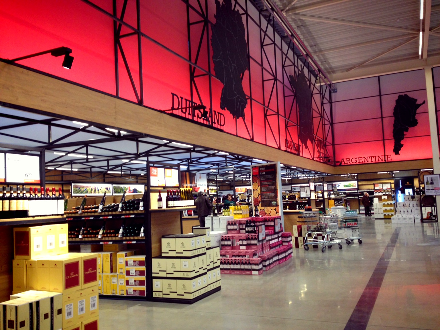 De wijnafdeling. Ieder land heeft een eigen hoek..Strak, modern en kleurrijk.